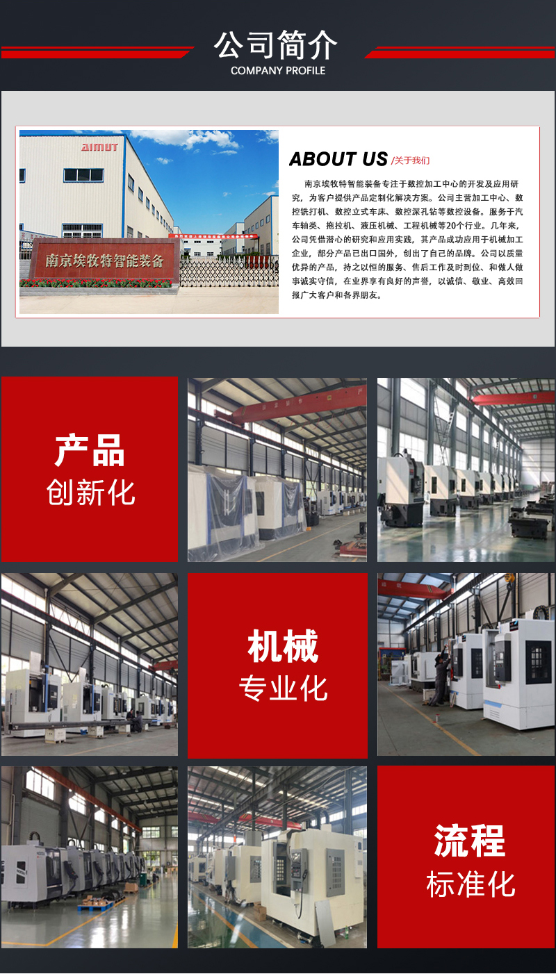 南京埃牧(mù)特智能裝備有限(xiàn)公司坐落於南京棲霞區,公司生產的(de)設備服務於汽車軸類、機械加工、模具行業、工程機械(xiè)等20多個行業(yè),是產品研發與技術服務型高新技術企業(yè)。公司主營數控銑打機、數控立式/斜式/雙頭車床、數控(kòng)深孔鑽、各種型號加工中心等(děng)數控設備。幾(jǐ)年來,公司憑借潛心的研究和應用實踐,其產品成功應用於機械加工企業並獲得良好的客戶(hù)反饋。公(gōng)司針對特殊工件加工工藝(yì),為客戶提供機械定製解決方案,形(xíng)成完成的研發、製造、檢測、組裝、調試、售後集一體的綜合廠家(jiā)。公(gōng)司培養了一支專業嚴謹的(de)技術開發和技術支持隊伍,建立了完整的技術服務體係。積極推進企業的技術(shù)創新、管(guǎn)理創新(xīn)、實現卓越經營。以質量優異(yì)的產品,持之以恒的服務和研發(fā)技術贏得(dé)眾多(duō)客戶的認可,在業界(jiè)樹立了良好(hǎo)的口碑。