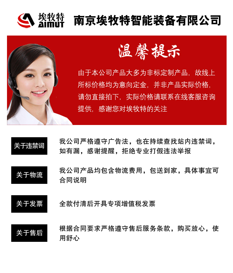 始終以誠信(xìn)、敬業、高效回報廣大(dà)客(kè)戶和各界朋(péng)友。一(yī)如既往地執著於(yú)以(yǐ)創新(xīn)締造(zào)自主品(pǐn)牌,衷心感謝每一位關心和幫助9I电影制作厂智能裝備(bèi)發展的朋友,埃(āi)牧特智能裝備願(yuàn)與你(nǐ)們(men)攜手共進!南京9I电影制作厂(tè)竭誠為您提供專業的專(zhuān)機定製方案和全麵的售前、售中(zhōng)、售後技(jì)術支持。我們有信心為您提供機械製造(zào)加工係列解決(jué)方案!